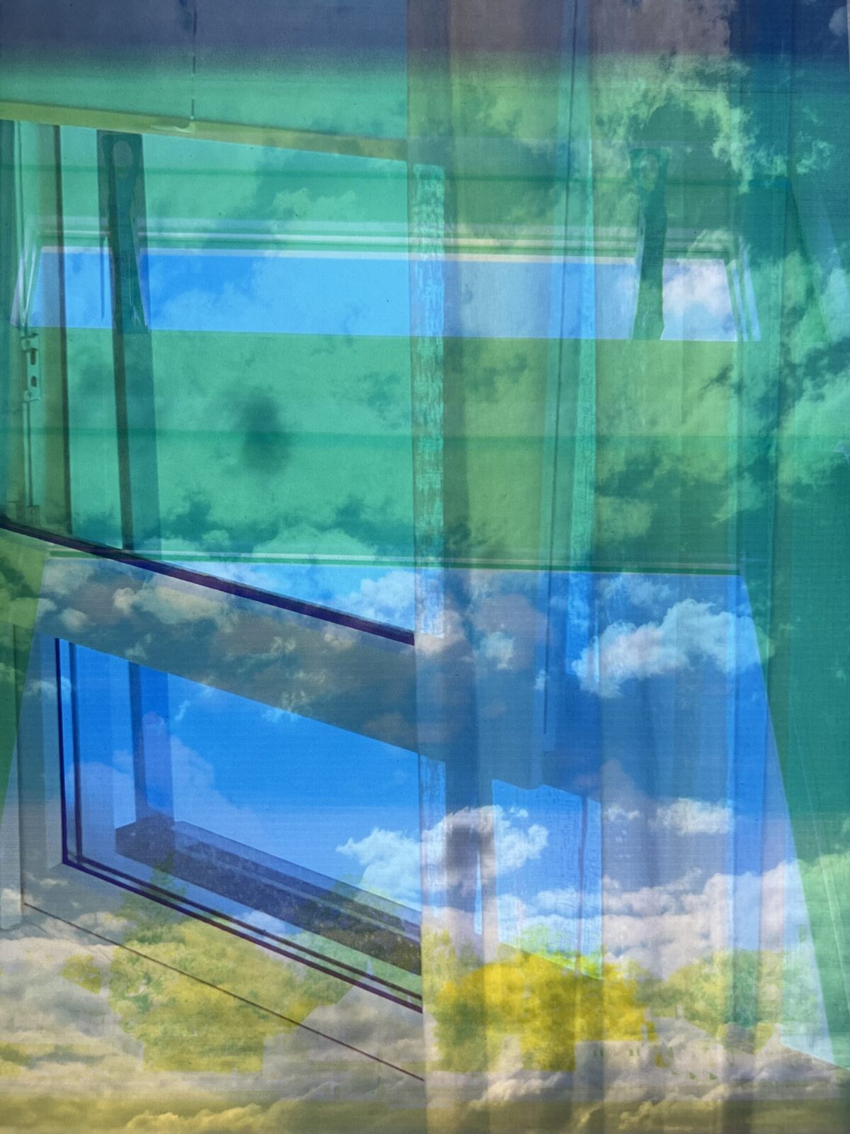 Ik vond dit zó inspirerend, dat ik hiermee verder ben gegaan, en “uit mijn raam” ben blijven fotograferen. Ik woon op de 4e verdieping, en fotografeer altijd al de spannende wolkenluchten, die voorbij razen. Ook werden openwaaiende gordijnen een bron van inspiratie. De ramen, die open en dicht stonden leverden interessante beelden op. Zó ontstonden grafische, bijna architectonische prenten. Hiervoor heb ik gebruik gemaakt van printen op verschillende transparanten, waardoor nieuwe beelden ontstonden.