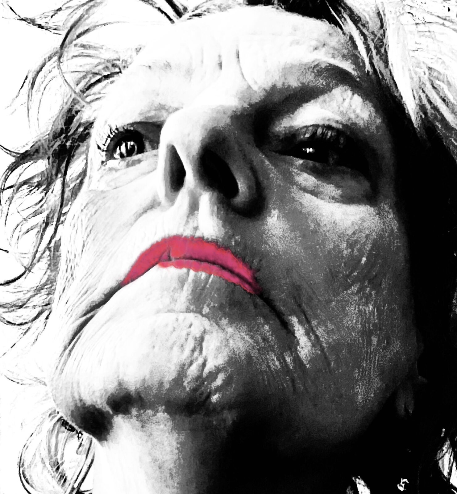 “Lipstick” zijn gedeeltelijk ingekleurde selfies in zwart-wit. Ik kijk naar mezelf met een dosis humor. Ik ben op zoek naar een nieuw gezicht, een nieuwe werkelijkheid.