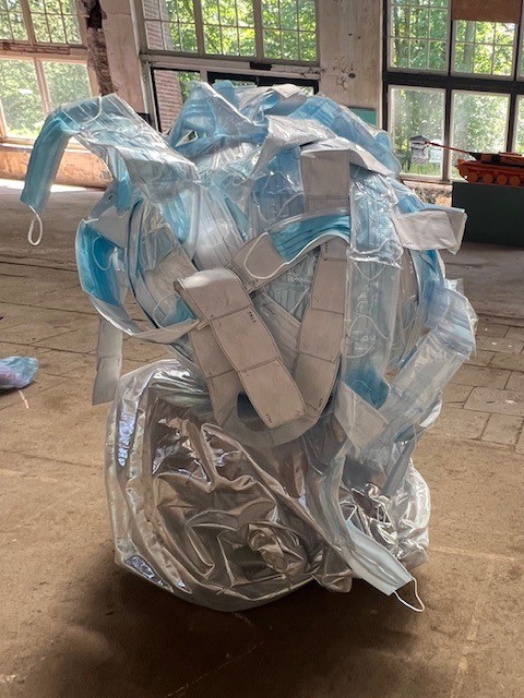 ‘Complicated’ is een object samengesteld uit mondkapjes, nietjes en zilverchiffon.